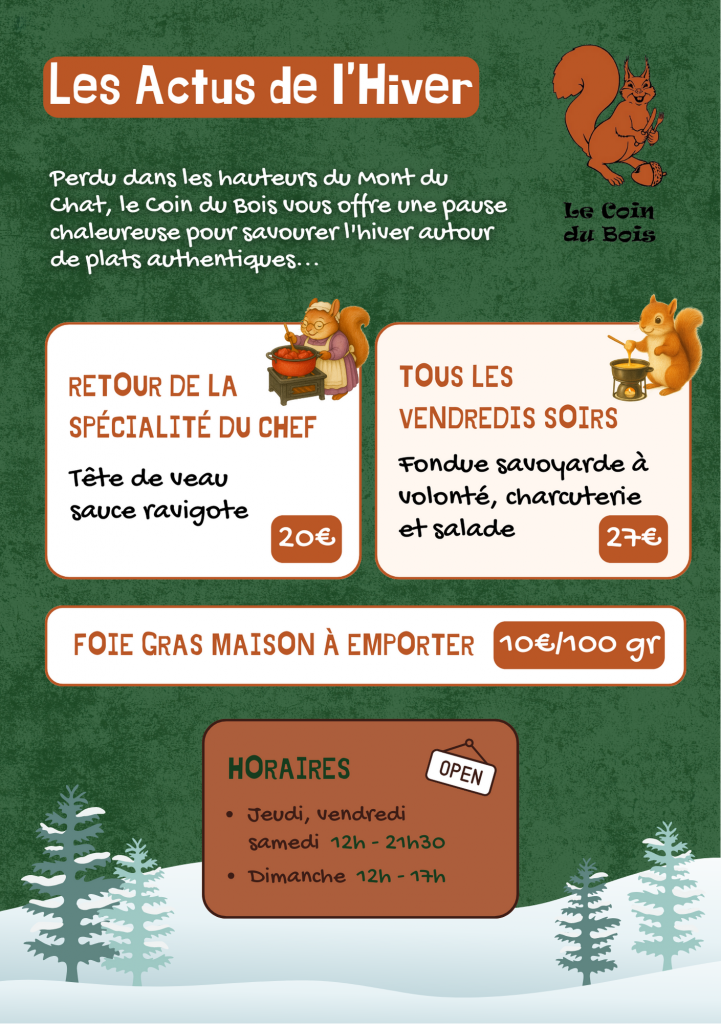 Lost in the heights of Mont du Chat, in the middle of nowhere, and provided with a large terrace, Le Coin du Bois offers you a dominant point of view on the Lac du Bourget and its surroundings, a site that you can only be seduced. Breath-taking on arrival, a full stomach at lunch, and a walk to digest. Everything has been designed to pamper and disconnect you.